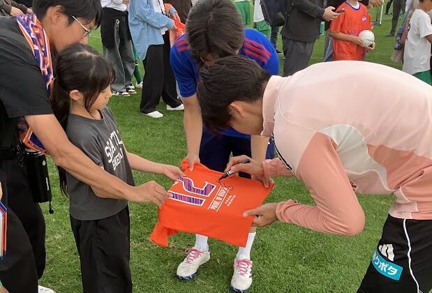 サッカー教室終了後は、選手との交流タイム!参加者プレゼントとしてお配りしたグッズや自分自身のユニフォームにサインをもらったり、一緒に写真を撮ったりして、選手と1対1での交流を楽しんでいただきました。